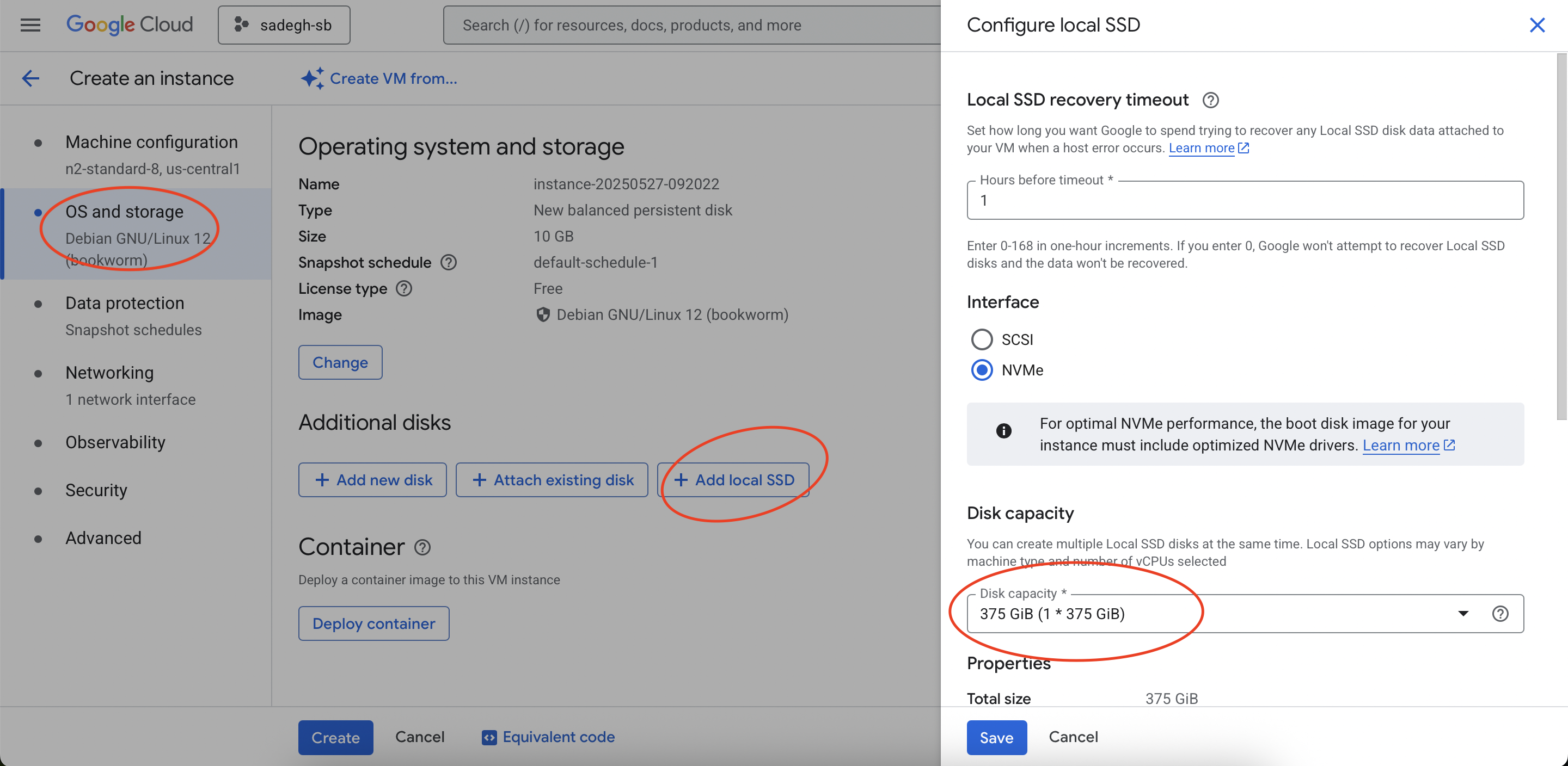 To add additional Local SSD Storage to a virtual machine, the operating system section must be selected in the wizard, then "Add local SSD" must be clicked. Now an additional disk can be added.